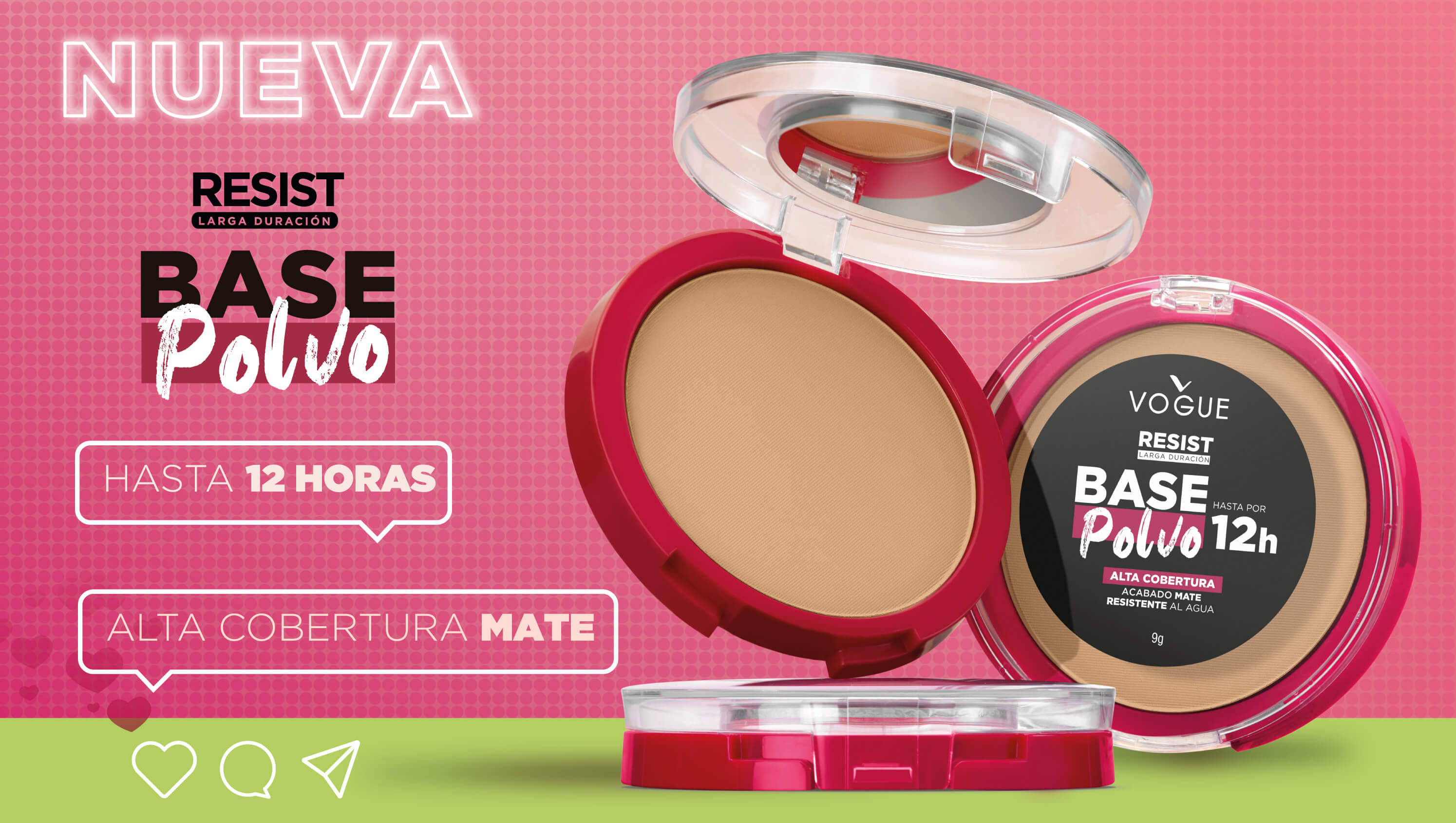 Conoce la nueva base polvo resist, con hipoalergénico, cobertura alta de base líquida, la textura ligera y la facilidad de aplicación de un polvo, dura hasta 12 horas, acabado mate, sensación y acabado aterciopelado y no transfiere, aprueba de sudor y humedad.